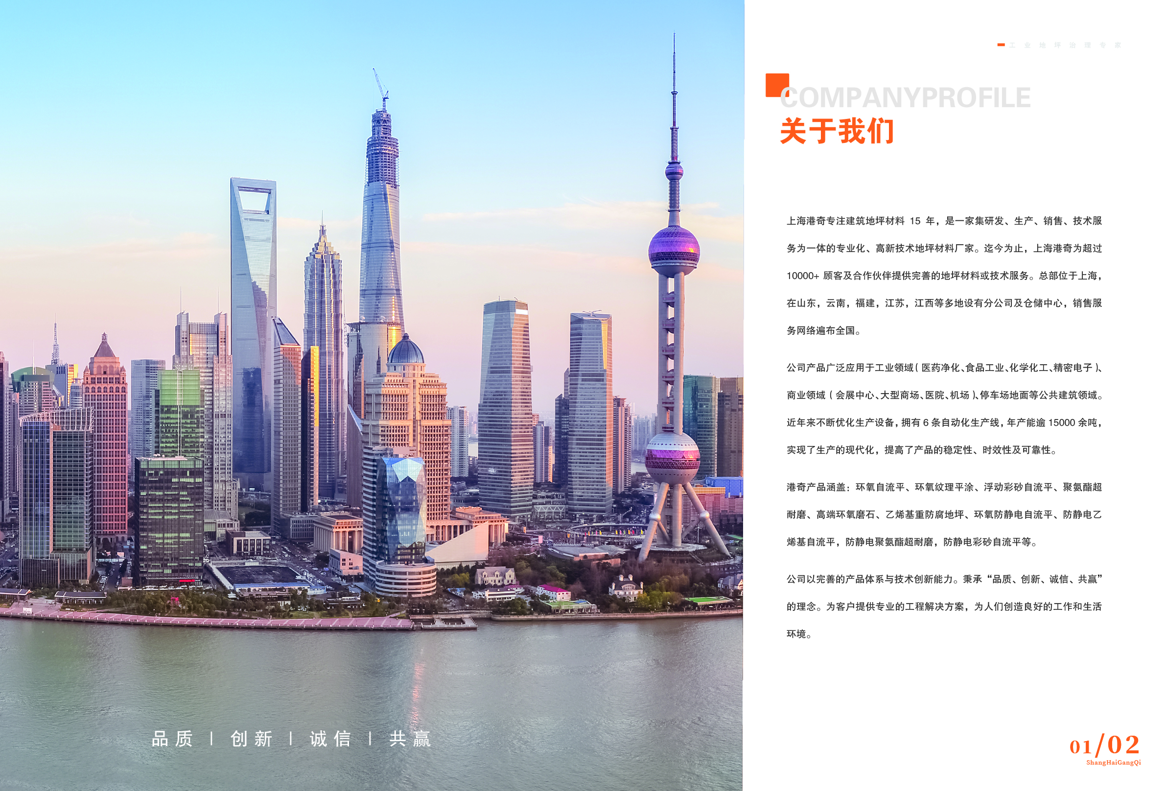 公司以完善的產(chǎn)品與技術(shù)創(chuàng)新能力,專注各類地坪材料研發(fā)和生產(chǎn)。秉承“品質(zhì)、創(chuàng)新、誠(chéng)信、共贏”的理念。為客戶提供專業(yè)的工程解決方案,為人們創(chuàng)造良好的工作和生活。